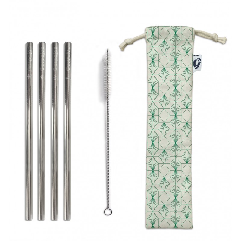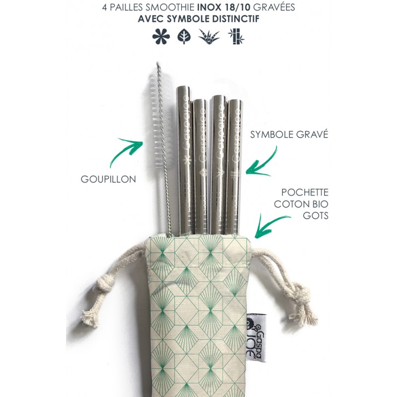 - Pailles: Acier inoxydable 18/10(haute qualité). Pochette: Coton bio certifié GOTS et impression à l'encre écologique.